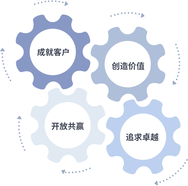 成就客户是一切决策的出发点,,,创造价值是衡量所有工作的标准,,追求卓越是我们做事做人的态度,,,,开放共赢是我们的格局也是最终的结果。。。价值观的齿轮环环相扣,,推动着组织里的每个人不断向前。。